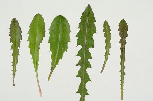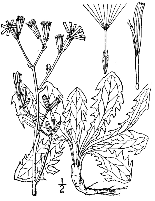 Rush skeleton weed forms a rosette of prostrate, glabrous leaves 1.6 to 24.7 inches (4-12 centimeters) long, 0.6 to 1.8 inches (1.5 to 4.5 centimeters) wide, and oblanceolate in shape. The leaf margins are deeply and irregularly toothed with lobes pointing backward toward the leaf base similar to the rosette leaves of dandelion. The leaf base narrows to a short, winged petiole. Basal leaves are well developed, 2 to 5 inches (4-13 cm) long and 0.6 to 1.8 inches (15-45 mm) wide, forming a rosette that is often deciduous at flowering. Stem leaves are lacking in some plants and when present are reduced, linear, 0.8 to 4 inches (2-10 cm) long and 0.04 to 0.3 inches (1-8 mm) wide. Stem leaves are also often deciduous, and upper leaves are often reduced to scale-like bracts.