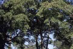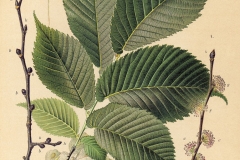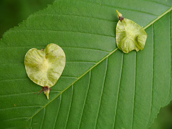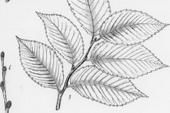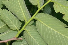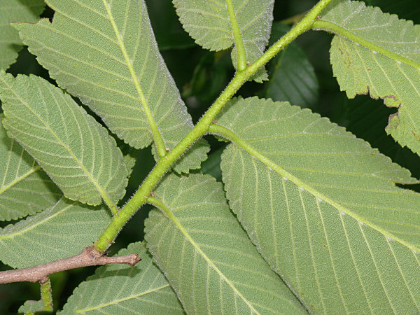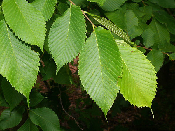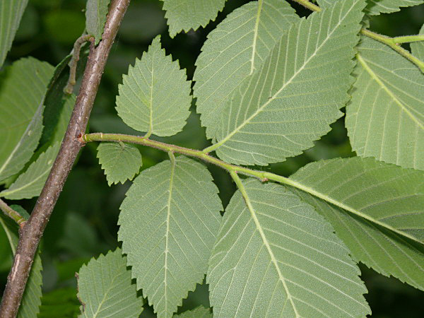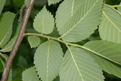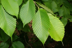 Simple, alternate leaves are 4-6 inch long and 2-3 inch wide; they are ovate to slightly obovate and doubly serrate along their margins. It is abruptly tapered to a pointed tip, rounded and asymmetrical at the base, on a short, hairy stalk. Leaf venation is pinnate with a central vein and about 12-15 parallel lateral veins. At least 4 lateral veins on each side of the central vein are forked. The upper leaf surface is dull medium green and rough-textured from stiff minute hairs. The lower leaf surface is whitish green and more or less covered with short pubescence. The white ribs of the veins are very prominent along the lower surface. The petioles are about ¼-½ inch long; light green, and short-pubescent. The leaves are arranged along each twig in two ranks. Edges are double-toothed with roughly half the veins forking towards the tip (easily seen on the underside). The deciduous leaves usually become dull yellow during the fall.
