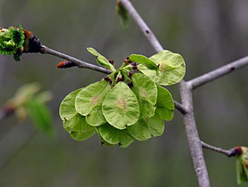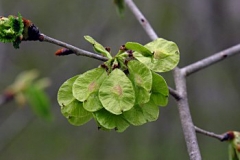 Fertile female or perfect flowers are replaced by samaras about ½-¾ inch across. Individual samaras are ovate to orbicular and flattened, consisting of a central seed body that is surrounded by a wide membranous wing. The membranous wings of the samaras are glabrous, while the central seed bodies are hairy. Each samara has a cleft tip that is only slightly notched. The samaras are initially green turning to tan at maturity; they are distributed by the wind during late spring as the leaves develop.