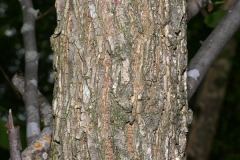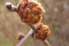 Slippery elm is a medium-sized, deciduous tree that grows about 60 to 70 feet (18-21 m) on average sites and 135 feet (41 m) on the best sites. Trunks are up to 35 inches diameter at breast height. The plant is found growing in rich mesic woodlands, floodplain woodlands, the lower slopes of wooded bluffs, rocky upland woodlands, shaded gravelly seeps, riverbanks, edges of limestone glades, thickets, and disturbed areas along railroads and roadways. The plants prefer wet and fertile soil nearby to water courses, though it can also survive in drier areas. The plant has shallow but wide spreading root. Trunk bark is mostly gray, consisting of narrow flat ridges and shallow furrows; inner bark is more reddish brown, as exposed by some of the furrows. Bark of branches and older twigs are more smooth and gray to reddish brown, while the bark of young twigs is reddish brown and hairy. Branches are ascending to widely spreading, becoming subdivided into numerous twigs. Young twigs are hairy and initially green, turning gray to gray-brown. Buds are up to ¼ inch long, elliptic, hairy at the tip, with hairy, dark brown to blackish scales. Flower buds are larger, round, densely covered in rusty-colored hairs.