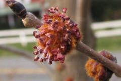 The greenish red flowers of Slippery Elm are unisexual or perfect (usually the latter); they are arranged in dense clusters of 5-20 flowers up to 1 inch across on short pedicels about 1/8 inch (3 mm.) long. Male, female, and perfect flowers have a short tubular calyx with 5-9 oblong lobes. The calyx is green and hairy; its lobes are erect. Male flowers have 5-9 stamens with reddish anthers, while female flowers have a pistil with a pair of stigmata that are plumose and pinkish red; perfect flowers have both stamens and a pistil. The blooming period occurs from early to mid-spring (March to May) before the leaves develop; the flowers are wind-pollinated.