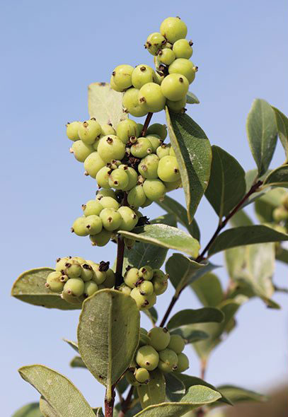 Shapes Globoid, fleshy, bright white drupe, about 1/3–2/3 inches (8–16 mm.) across in diameter, with a waxy surface texture