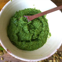 - Finely chop almonds and garlic or put them into a blender with lemon zest, 1/2 cup oil, and the salt.
