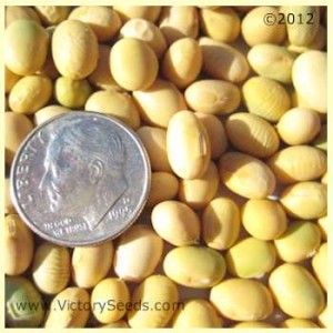 Geant Vert SoybeanIts name literally signifies “Green Giant” in French. The plants reach nineteen to twenty-two inches high, have purple flowers, and two to three beans per pod.  The seeds are large, pale green with black eyes, oval shaped, and medium in size.