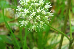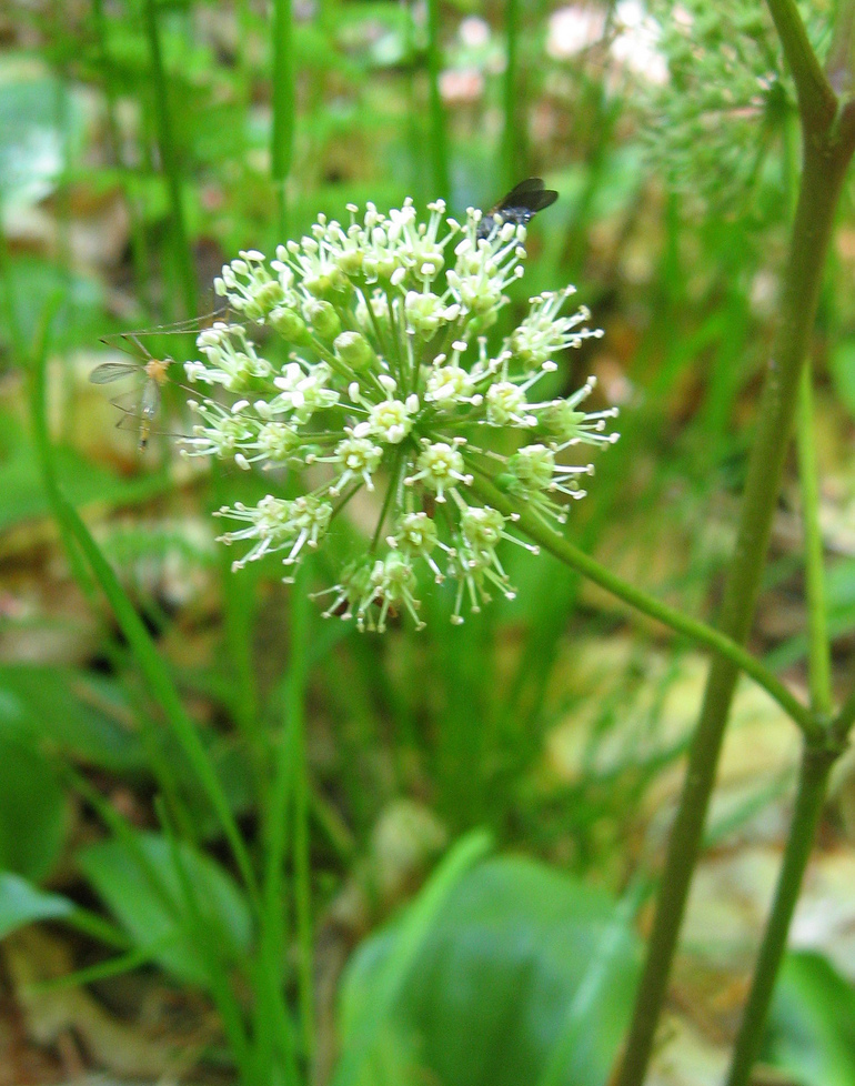 Flowers are white in rounded clusters of greenish to white on top of leafless stem. Clusters are rounded and 3 to 5 cm wide. Flowers have tiny petals. The plant flowers on late May or June. After blooming, purplish-black berries appear and grow in clusters.