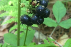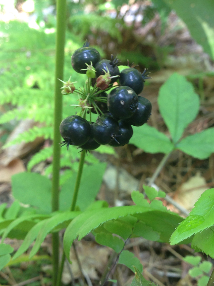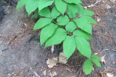 Stem is a single, short and swollen stem which gives rise to long leaf stalk about 12 to 14 inches tall. Stalk branches at the top into three parts each bearing 5 leaflets 2-4 inches long. Shorter stalk also arises from the stem and branches into three clusters of greenish white flowers in May to June. Flowers mature month into blue berries which closely resemble fruits of low bush blueberries ripening at about the same time. Stalk branches at the top into three parts. Leaflets are 2-4 inches long.