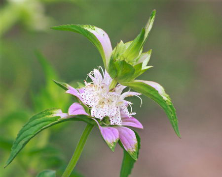 Spotted Beebalm is an aromatic, erect herbaceous perennial plant that grows about 1 feet to 3 feet (0.3m-1m) tall. The plant is found growing in sand prairies, hill prairies, sandy Black Oak savannas, stabilized sand dunes along Lake Michigan, and sandy fields. This species can be found in both disturbed and higher quality sandy habitats. The plant prefers average, dry to medium moisture, well-drained soils in full sun to part shade. It is best in sandy soils with consistent moisture. The plant can tolerate somewhat poor soils and drought. The plant has taproot and hairy rigid stems that are unbranched, reddish, square, obtusely angled, hoary and pubescent.
