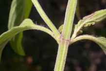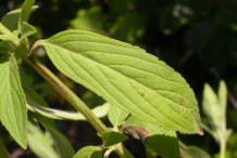Leaves are opposite, lance-like, up to 3½ inches long and 1 inch across, with shallow teeth and a pointed tip. Bottoms of the leaves are hairy and paler in color from the fine hair. Leaves have short stalks with fine hair, and base of the leaf tapers to the stalk with a wing effect. Smaller leaf growths are frequently seen at the base of the leaf stalk.
