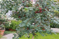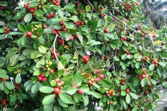 Strawberry Cherry is small erect, highly-branched, slow growing evergreen shrub that grows about 2-6 m tall. The plant is normally found growing in sub-montane rainforest, montane cloud forest, montane rainforest, moist tropical montane forest, riparian forest, tropical evergreen forest, deciduous woodland (oak), tropical montane savanna, lowland sub-tropical rainforest, scrubland, grassland, degraded forest, cultivation and agroforestry systems, roadsides, wastelands, pastures, scrubs, forested land and on areas disturbed by natural processes such as storms and lava flows. The plant prefers acid soils and is not sensitive to soil structure. It can grow on shallow or infertile soils. It does, however, requires a well-drained soil and does not tolerate waterlogging. The slender stem and branches are smooth, pinkish, greenish or greyish brown in color. Bark peels off in small papery flakes. Twigs are glabrous and cylindrical, and young leaves and twigs are red in color.
