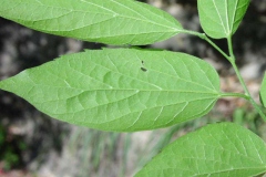 Leaves are deciduous, simple, petiolate, alternate, distichous, about 6–8 cm long, 3–4 cm wide. Leaves are usually lanceolate, ovate or oval shaped, and often curve to one side. Leaf margins are mostly untoothed, but a few (rarely many) small teeth may be present. Leaf apices are acuminate or acute or caudate. Leaf bases are cuneate or oblique or obtuse or rounded. Leaves bear 3 prominent veins that branch from the base of the leaf blade. Upper surface of the leaves are green or yellow-green, glabrous or glabrate while lower surface are green or yellow-green, glabrous or glabrate. Light green leaves turn bright yellow in fall and can be showy in some years. Petioles are 0.6–1.3 cm long and glabrous. Stipules are present and are caducous.
