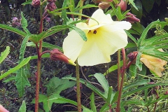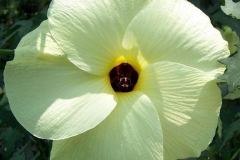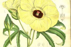 Flowers of this family are 4-8 cm in diameter with white to yellow petals, usually rolled up together in a bud or dying. The stamens and style form a long tube protruding from the center of the flower with purple color. Flowers are usually 3–4-fascicled, axillary, cymed, and rarely solitary on the stem. The flowers are also hermaphrodite, often arranged on racemes with a tuft of hairs at the apex. The pedicles are less than 2.5 cm. long, axillary and clustered at the ends of the branches, stout, sometimes with a few prickles. The hibiscus-like flowers are a brilliant lemon color with deep purple centers and long pedicels at the apex of the plant. Flowers sprout in the warmer months and they are pollinated by insects with variable levels of cross-fertilization. The petals can be added to salads or used in cooking. The large yellow flowers are very ornamental and, this plant is very important because that it is one of the most nutritious leafy vegetables in the world because of its high protein content. Flowering normally takes place from July to September.