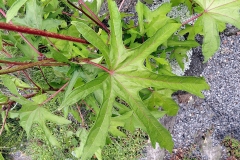 Leaf is palmately lobed, crenate or oblong ovate, smooth and often with an even with a fairly prominent midrib. Leaves are 10-40 cm long and broad with 3-7 lobes, the lobes are very variable in depth from basely lobed to cut almost to the base of leaf, which is more or less scab rid and hairy, ovate, acute or obtuse, sometimes cordate, alternately or stipulately. Petiole is 3-25 cm long; stipules are filiform or lanceolate, 5-12 mm long. Leaf-blade is linear, lanceolate, cordate or deeply lobed or parted with 3-7 segments, color varying from light to dark green through red to purple.