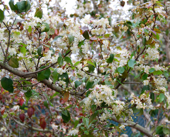 Surinam Cherry is an evergreen, multi-branched shrub or small tree reaching 10 m (30 ft.) in height. The leaves are opposite, simple, pinnate, ovate or elliptic to ovate, shiny dark green and 2.5-8 cm (1-3 inch) long. The flowers have four white petals, thin, obovate, fugacious, fragrant and 13 mm (0.5 inch) across. The fruit is depressed to globose; 4 cm (1.5 inch) wide and 1 inch diameter. The fruit flesh is orange to red. Fruit possess 2 or 3 small seeds and light brown.