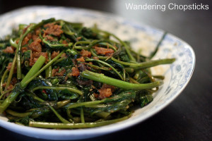 • Then add Swamp cabbage till it is wilt. Add some salt to release water. Reduce heat and cover it for about 1 to 2 minutes. Then add 1-2 tbsp. salted fish sauce, salt and pepper. The stalks should be slight crisp.
