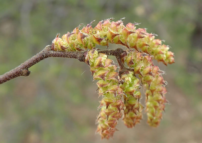 The female catkins are about ½” long and ovoid to globoid in shape, consisting of a small cluster of female florets and their scales. Each female floret has a naked ovary with a pair of stigmata at its apex; it is partially hidden by a small scale (about 2-3 mm. in length) that is broadly ovate and ciliate along its margins. In addition to this scale, there is a pair of linear bractlets that originate from the base of the ovary; they are up to twice the length of the scale. The blooming period occurs from mid- to late spring as the vernal leaves begin to develop, lasting about 2 weeks.