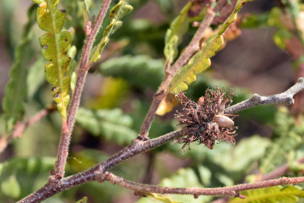 Leaves are simple and alternate, the blades are linear-oblong or lance-linear, 1¼ to 5 inches long, 1/3 to ¾ inch wide, the base and tip sometimes blunt or tapered to a sharp point, short-stalked or stalkless. The edges are toothless but fern-like with deep, rounded to squarish lobes with blunt or pointed tips. The upper surface is dark green, hairy or becoming smooth, lower surface pale green, hairy or becoming smooth. Both surfaces are heavily dotted in yellow glands. At the base of the leaf are pair of leafy appendages (stipules) that are somewhat heart-shaped with a long taper to a sharply pointed tip. Fall color can be nice reddish before turning brown.