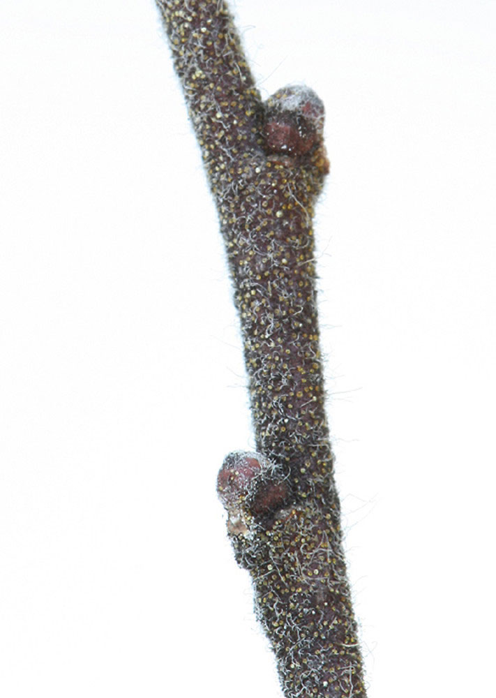 | Twigs | Slender, gray-brown, fuzzy; buds round, plump, male catkins present in the winter, resin dots often present |
