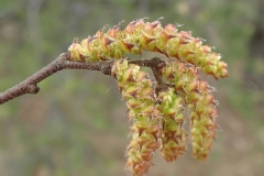 Male and female flowers are borne separately on the same plant (monoecious) or different plants (dioecious) that are arranged in greenish catkins toward the tips of twigs or young shoots; flowering occurs before leaves emerge. Male catkins are drooping and cylindrical, ½ to 1¼ inches long, single from lateral buds, mostly crowded at tips of one-year-old twigs, with 25 to 50 flowers each with a sharply pointed scale-like bract. Each male floret has 4-8 stamens on short filaments; it is partially hidden by a small scale (about 2-3 mm. in length) that is broadly ovate and ciliate along its margins.