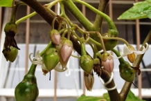 Tamarillo is a fast growing tree which grows upto the height of 5 meters. The life expectancy of the plant is about 12 years but it reaches its peak production after four years. The trees have single upright trunk and lateral branches. Lateral branches held flowers and fruit. Leaves are simple, large, perennial and possess strong and pungent smell. Flowers are pink to white and usually form in 10 to 50 clusters. A cluster produces one to six fruits. Without cross pollination also the plants could bear fruit. The fragrant flowers attract insects. The tree has shallow roots. It is not tolerable to drought stress and could be damaged by strong winds.