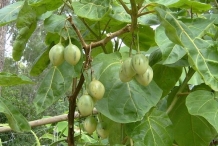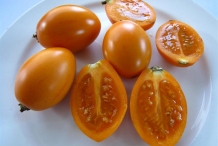 The plant bears fruit of egg shaped which measures about 4 to 10 centimeters long. The color of the fruit differs from yellow and orange to red and purple. It may have dark and longitudinal stripes. Yellow or orange fruits are sweeter and red fruits are acetous. Flesh has firm texture and possesses larger seeds.