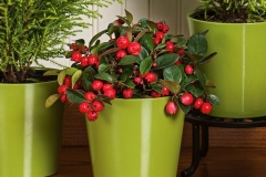 Afterwards, fertile flowers are replaced by small berry-like capsules that become mature during late summer or early autumn. Mature fruits are about ¼ to ⅓ inches or slightly more across, and globoid in shape. The berries are initially a very light green (in late August and early September), usually maturing to bright red by around October. They have a fleshy interior that is slightly sweet and minty (wintergreen) in flavor. Each berry has a distinctive notched pucker on its underside and contains numerous tiny seeds. The berries often persist throughout the winter (unless eaten by wildlife or passing humans) and are said to be larger and tastier in the spring than in autumn.
