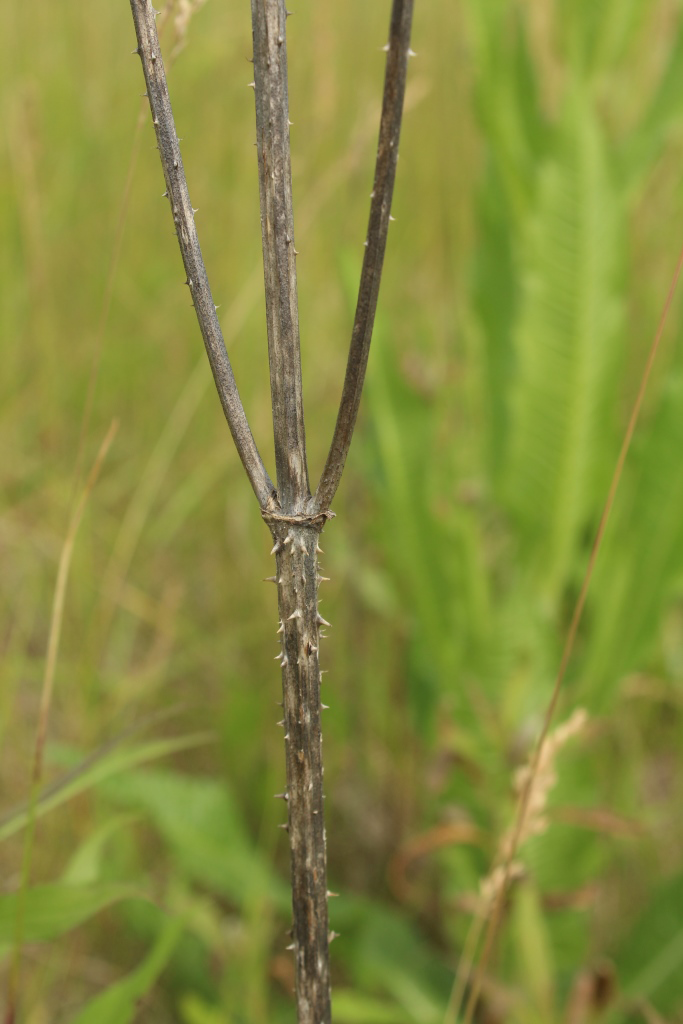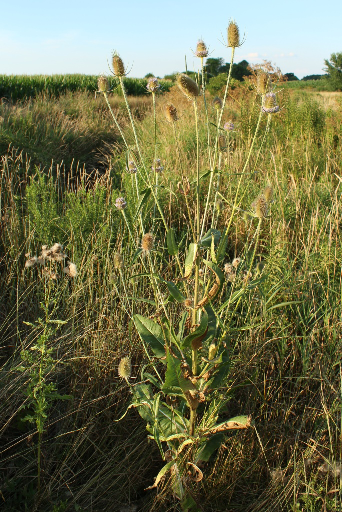 Teasel is a tall, somewhat spiny, herbaceous, robust, biennial prickly and monocarpic perennials plant that grows about 7 to 10 feet (2-3 m) tall. The plant is found growing in mesic prairies (especially cemetery prairies), degraded grassy meadows, creeks, savannas, woodland borders, pastures and abandoned fields, landfills, roadsides, and waste areas, roadsides, ditches and in pastures, old fields, riparian areas and forest edges. The plants grow on a variety of soils from sandy soils with abundant moisture to heavy clays in poorly drained areas. The plant has stout taproot with a fibrous secondary root system that are more than 2 feet (0.6 m) long and 1 inch (2.5 cm) in diameter at the crown. Erect, hollow, hairless stems are pale green to reddish green. They have scattered white prickles and flat longitudinal ridges.