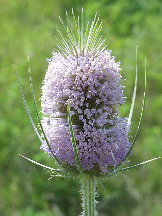 Teasel flowers occur in terminal, stiff, egg-shaped heads that are up to 4 inches (10 cm) long. The entire flower head (peduncle) measures anywhere between 50 and 100 centimeters in height and consists of tiny individual flowers that measure 10 to 15 mm long. Inflorescences contain 250 to 1,500 flowers, which bloom for only 1 day. Flowering begins in the middle of the inflorescence and then progress up and down. Often there are few flowers blooming at the same time. Flower heads are subtended by linear bracts that are about 4 times as long as they are wide. Individual flowers, which are 2/5 to 3/5 inch long, consist of white petals united into a tube with 4 purple lobes. Below each cluster are several long, slender, stiff, bracts that curve upward. Within the cluster, there are many short, stiff bristles. Once mature, flower clusters become dry, hard, and persistent. Teasel flowers appear between late June and September. Flowers are followed by light brown, ridged, hairy, and 4 angled achenes that measure up to 8 mm long. Enclosed in each fruit is a single seed. Seeds are small and are spread by the wind after the seed-head has dried.
