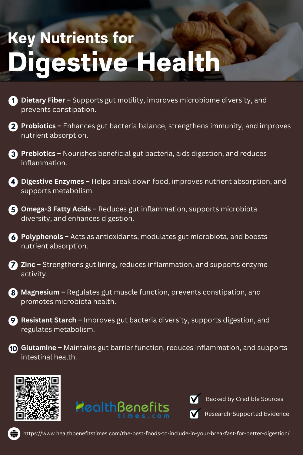 A healthy digestive system relies on key nutrients like fiber, probiotics, prebiotics, hydration, and healthy fats. These nutrients support gut function, promote regularity, and enhance nutrient absorption for overall well-being.