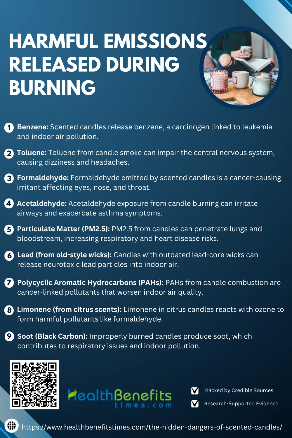 Scented candle combustion can release polycyclic aromatic hydrocarbons (PAHs), which are toxic compounds linked to cancer and respiratory illnesses. The EPA identifies PAHs as serious indoor pollutants. Studies on ScienceDirect and NCBI report their frequent detection in candle emissions. (4✔) NIH confirms PAHs form through incomplete wax combustion, posing risks in poorly ventilated areas. (5✔)