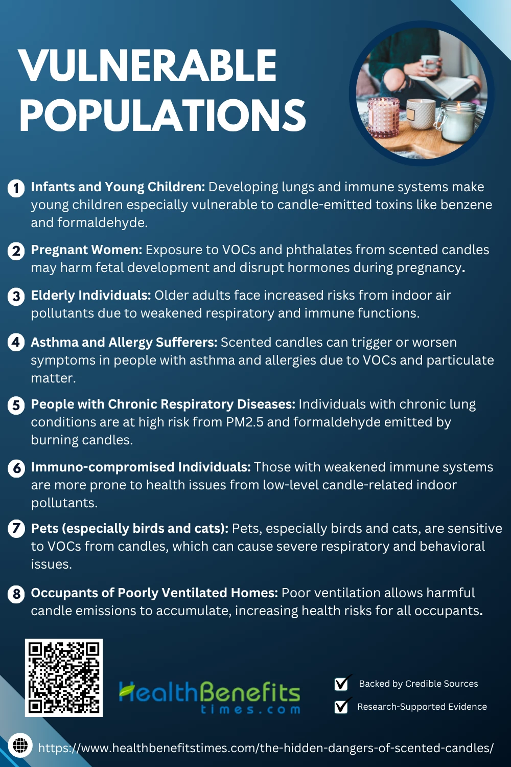 Individuals with weakened immune systems are more susceptible to the harmful effects of VOCs and formaldehyde released by scented candles. The EPA highlights that even low-level exposure can trigger health complications in immunocompromised persons. (2✔) NCBI emphasizes increased vulnerability due to impaired detoxification. (4✔) ScienceDirect links indoor pollution from candles to heightened risks of infection and inflammation.