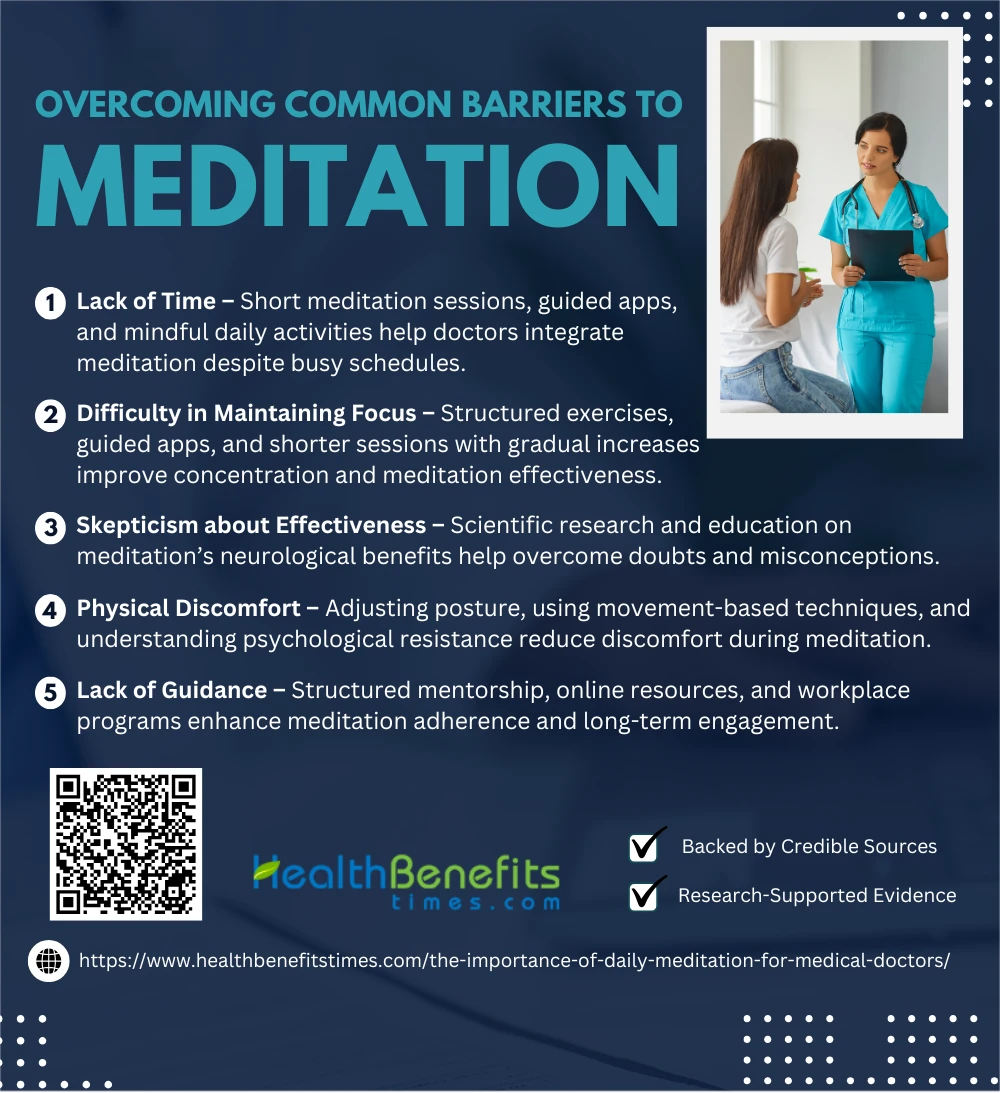 Many doctors struggle with meditation due to time constraints, skepticism, or unfamiliarity. Overcoming these barriers through flexible techniques, mindset shifts, and practical strategies can make meditation a sustainable, beneficial habit.