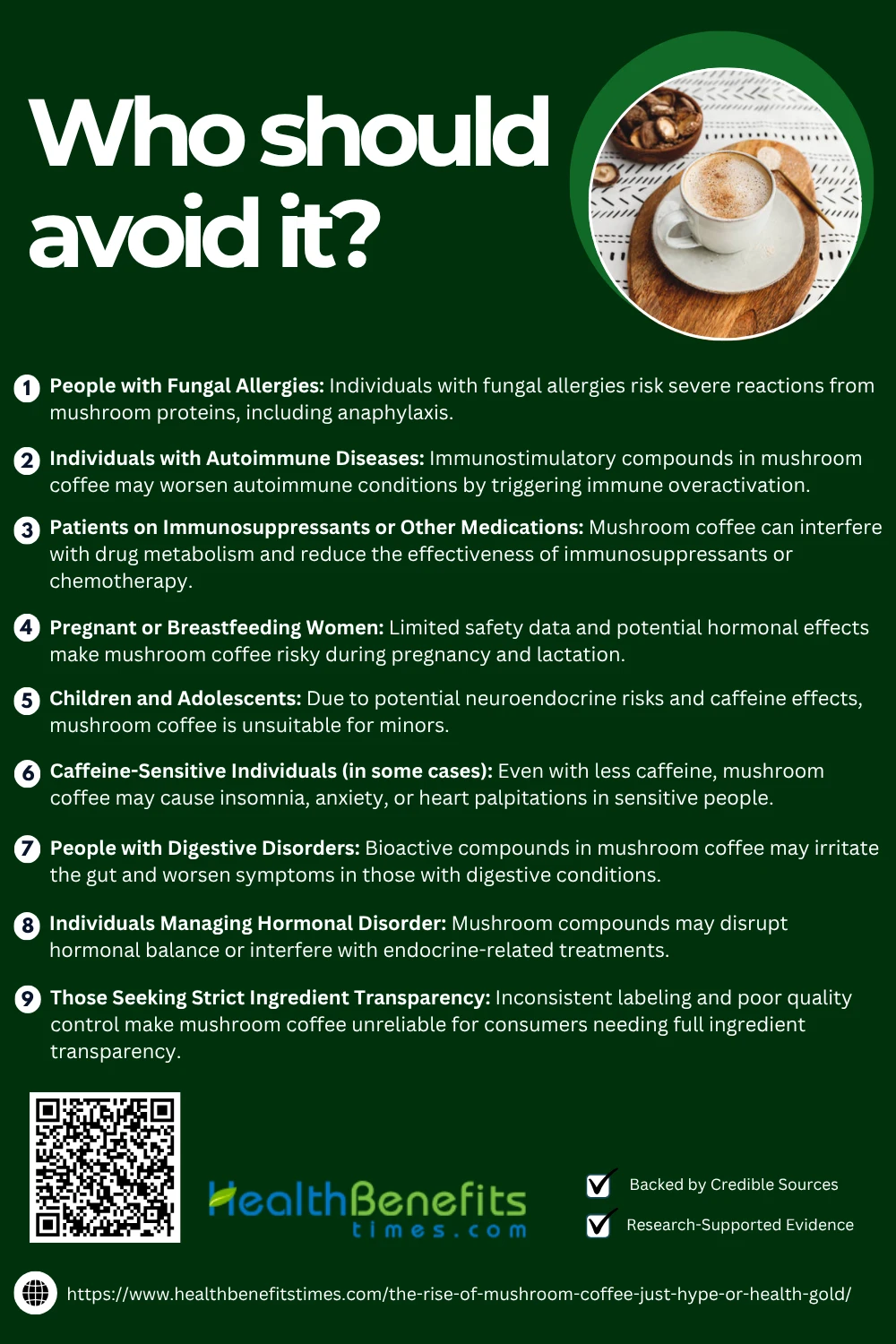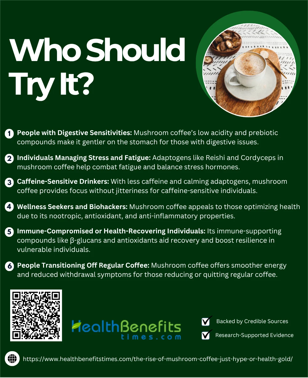Mushroom coffee may not suit everyone. Individuals with mushroom allergies, certain medical conditions, or those taking immune-related medications should avoid it or consult a healthcare provider before consuming.