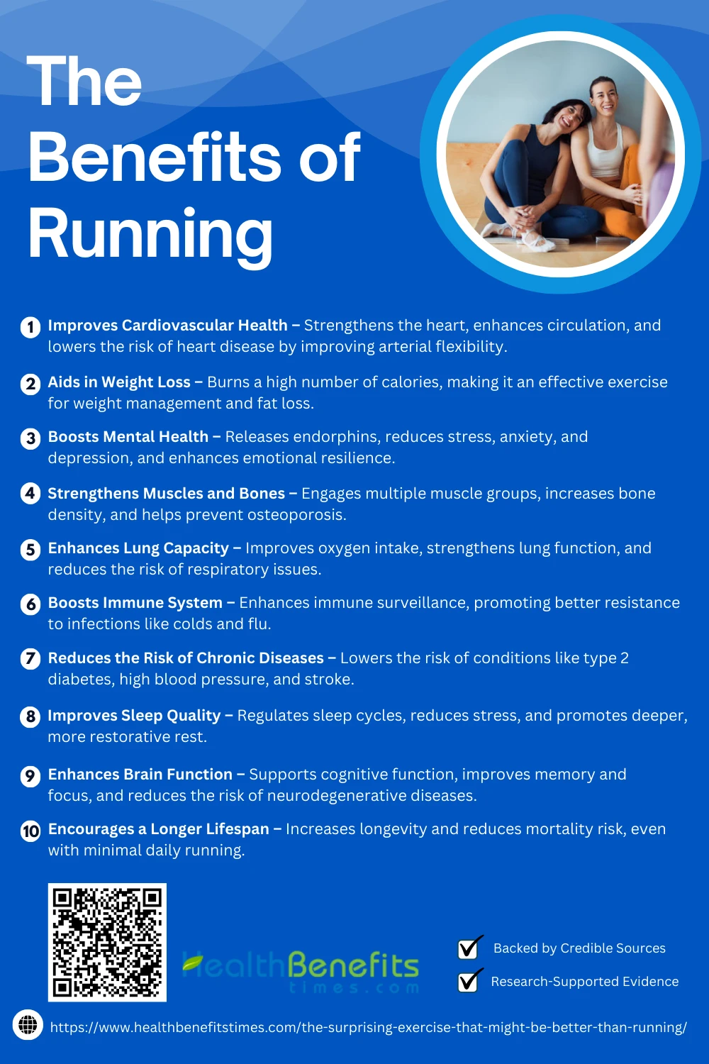 Running is a simple yet powerful exercise that provides a wide range of health benefits, from improving cardiovascular health to enhancing brain function. Below, we explore these benefits in detail: