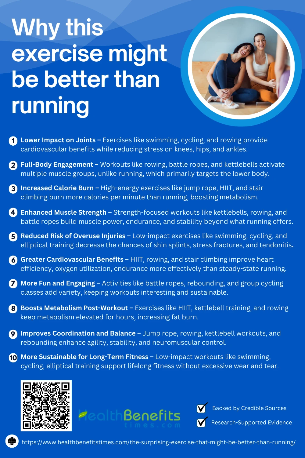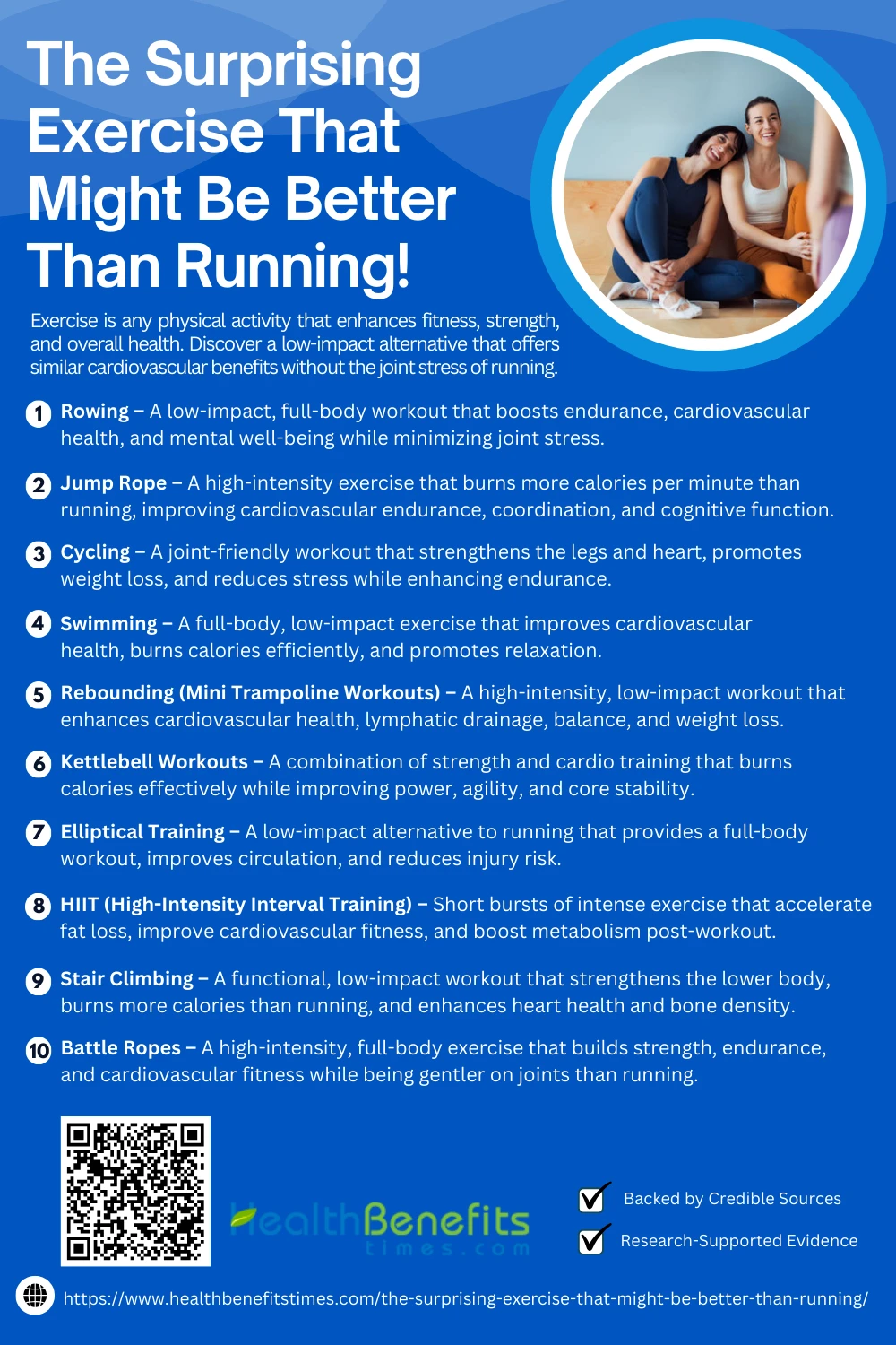 Running is a high-impact aerobic exercise that involves continuous movement on foot at a steady or varied pace, often used for cardiovascular fitness and endurance training. While running is widely praised for its ability to improve heart health, aid weight loss, and boost mental well-being, it also comes with drawbacks such as joint strain and a high risk of overuse injuries. Surprisingly, recent studies suggest that an alternative form of exercise could provide similar or even greater benefits without the negative impact of running. This lesser-known workout not only enhances cardiovascular endurance but also engages more muscle groups, leading to improved overall fitness. So, what is this surprising exercise that might outperform running? Let’s dive in!