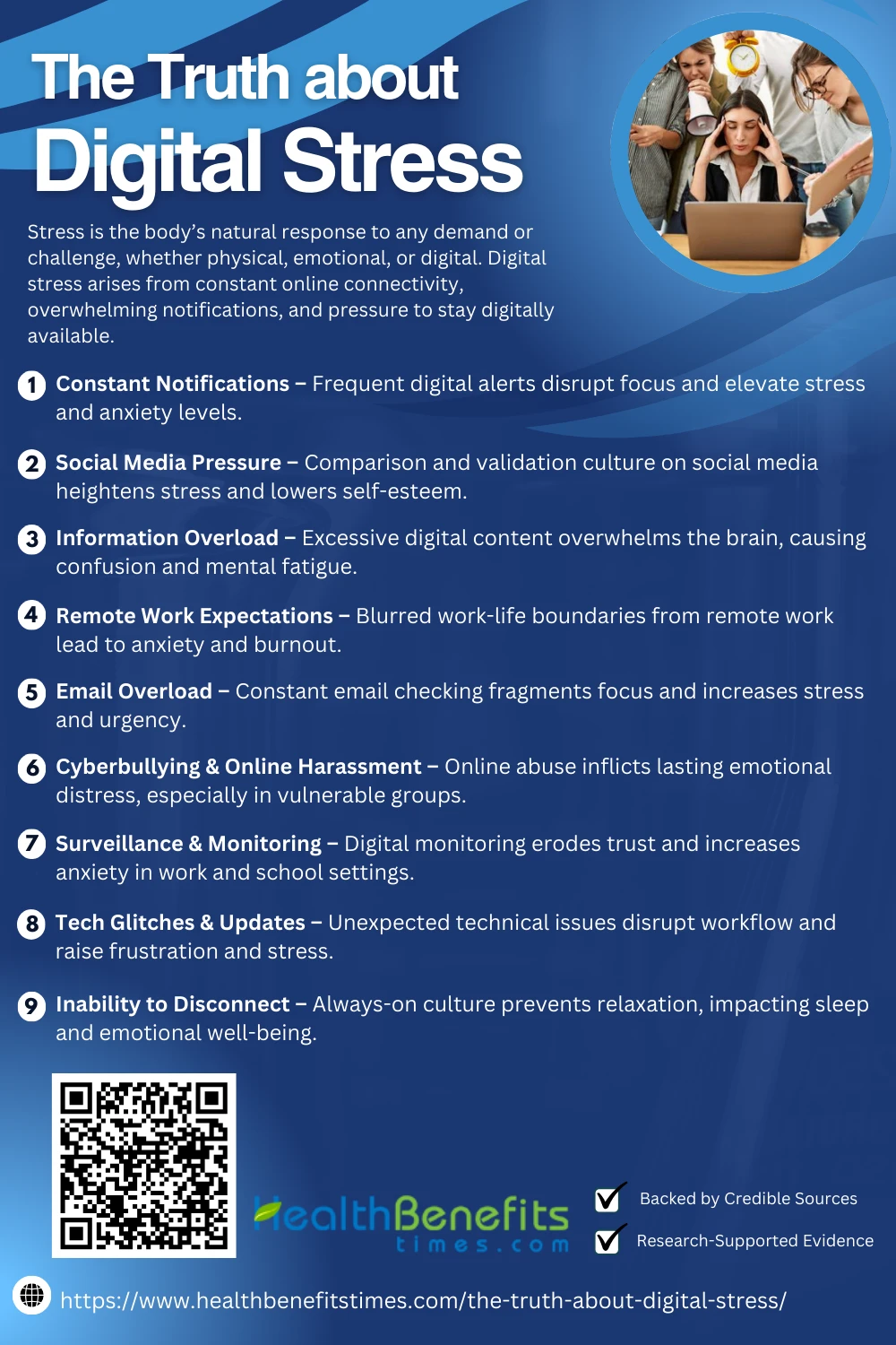 Digital stress stems from constant connectivity, overwhelming notifications, social media pressure, and information overload. These digital demands can trigger anxiety, disrupt focus, and blur boundaries between work and personal life.