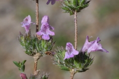 Savory with thyme leaves has a base that is mostly woody and has many branches. The stem has lignin in it, which makes it semi-woody. As the plant grows, the stem can become stiffer. Savory with thyme leaves is a small, low-growing perennial plant. Its stems can grow straight up or spread out along the ground, getting about 20 to 40 centimeters (8 to 16 inches) tall. Thyme-leaved savory has small, fine hairs all over its stem, which gives it a slightly fuzzy or pubescent feel. The younger parts of the stem have a stronger appearance like this. There are parts of the stem called nodes and internodes. Nodes are the parts of the stem where leaves, branches, or flowers connect. Internodes are the parts of the stem that are between the nodes. Savory stems with thyme leaves can branch out from the nodes, making the plant look thick. The design of branches can change based on how the plant grows and how much it is pruned.