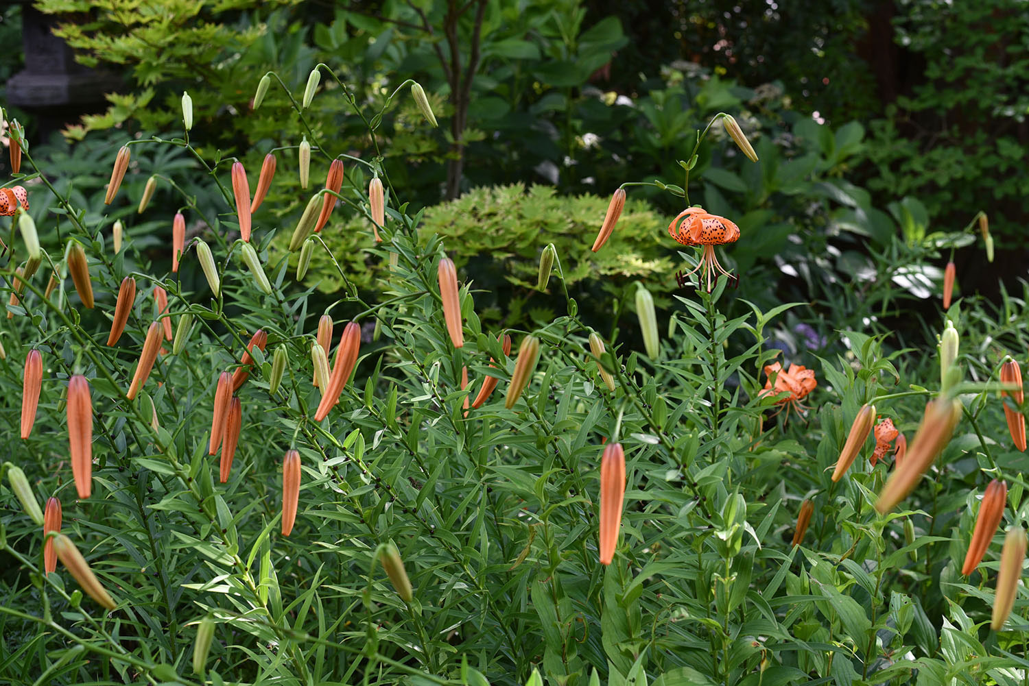 Tiger Lily is a hardy, vigorous, bulbous herbaceous, perennial plant that normally grows about 1 to 1.5 meters tall and can reach a width of 30 to 60 centimeters. The plant is found growing in woods, thickets, river banks, grassy slopes in lowlands, hillsides and mountains, buildings, cemetery prairies, savannas, abandoned homestead sites, vacant lots in urban areas, roadsides and areas along railroads. The plant grows well in full sun, in well-drained, humus-rich loamy soil. It is widely cultivated in Asia for its edible bulbs and for medicinal uses. Stems are 0.8–1.5 m, erect, unbranched, light green, purplish green, or purple, terete, and moderately woolly-hairy to glabrous.