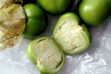 Tomatillos are a small, green Mexican fruit with a Japanese lantern-type shell surrounding it. While they’re from the tomato family, and do look like small, green tomatoes inside the papery covering, tomatillos appear more like cape gooseberries. The fruit resembles a small unripe tomato and is usually green or yellow. The yellow color indicates ripeness, but tomatillos are often used when they are green. The husk that holds the fruit is paper-like and is light brown. The husks are inedible and should be removed before use. When removing the covering, the fruit seems a little sticky but this can be easily washed off. The fruit contains a pectin-like substance that thickens as it cools. The inside is white and meatier than a tomato. The flesh is somewhat acidic with a hint of lemon. Tomatillo should be consumed as soon as it is plucked from the plant, if one decides to store it then they should be kept intact with their husk which prevents them from spoilage. Normally they’re about the size of a large walnut or a small lemon and are 30-50 g.