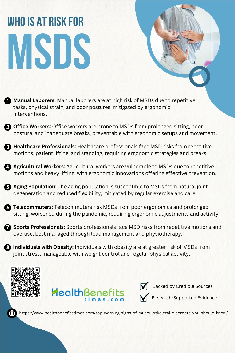 Musculoskeletal disorders (MSDs) can affect anyone but are more common in certain groups. Identifying risk factors helps with prevention.