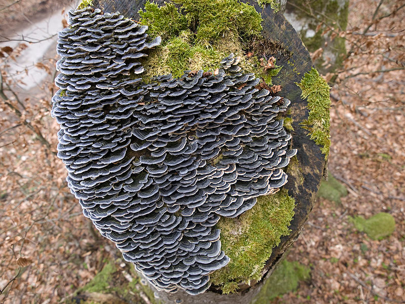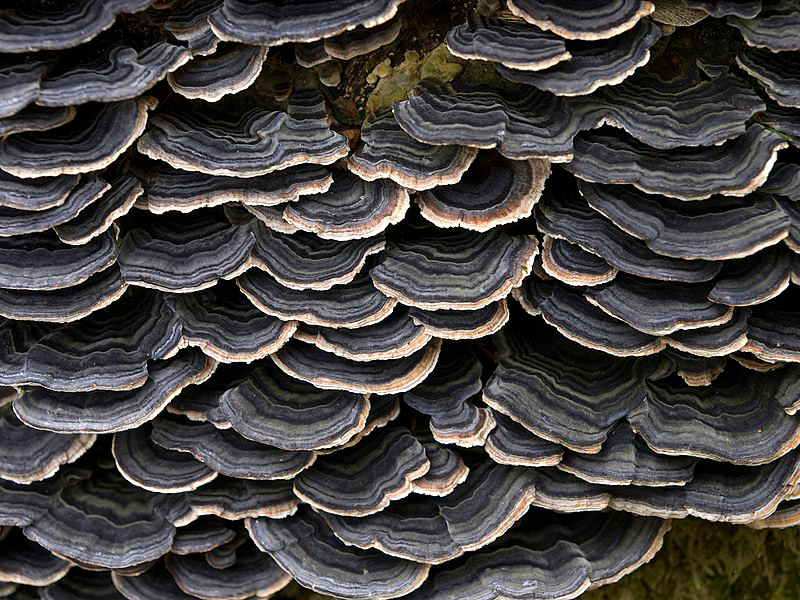 Turkey tail is a common polypore mushroom which is found growing in saprobic to weakly parasitic; clustered, usually overlapping or in fused rosettes on dead deciduous wood or on dying trees, rarely on Conifer wood.