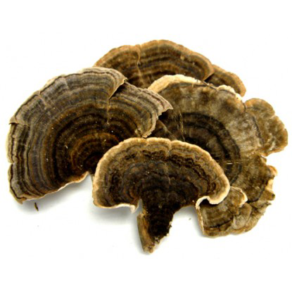 Turkey tail mushroom grows on dead logs in woodland environments worldwide and gets its name from the brown and tan rings that look like the tail feathers of a turkey. It’s a type of bracket fungi, which means that it forms thin, circular structures that appear leaf-like. The mushroom is best known to stimulate immune function and reduce inflammation. It has a long history of use in Asia among practitioners of traditional Chinese medicine, who used formulations of turkey tail to promote general health, strength and longevity. It is used in traditional Chinese medicine as a tonic, and recent studies suggest that it has immune-stimulant and anti-tumor properties.