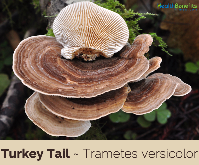 Turkey Tail, scientifically known as Trametes versicolour or Coriolus versicolour, is a common polypore mushroom found throughout the world. It is a beneficial mushroom of the Agaricomycetes class and Polyporaceae family. It’s one of the 100 species of mushrooms that have been researched for their medicinal properties. The mushroom is native to Europe, Asia and North America and is found growing abundantly throughout the world. Few of the popular common names of the mushroom are Turkey tail, turkey tail fungus, Many-zoned Polypore, PSK, PSP, VPS, Yun Zhi, Kawaratake and Krestin. Trametes means “one who is thin”; versicolor means “of various colors” in reference to the strongly zonate cap. Turkey tail mushroom, or otherwise referred to as turkey tail fungus, may just be one of the best functional foods and mushrooms out there.