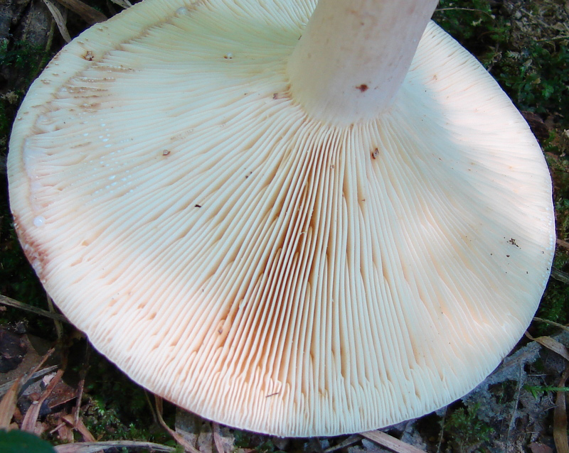 Gills are attached to the stem or running slightly down. It is creamy white and discoloring to brown when injured.