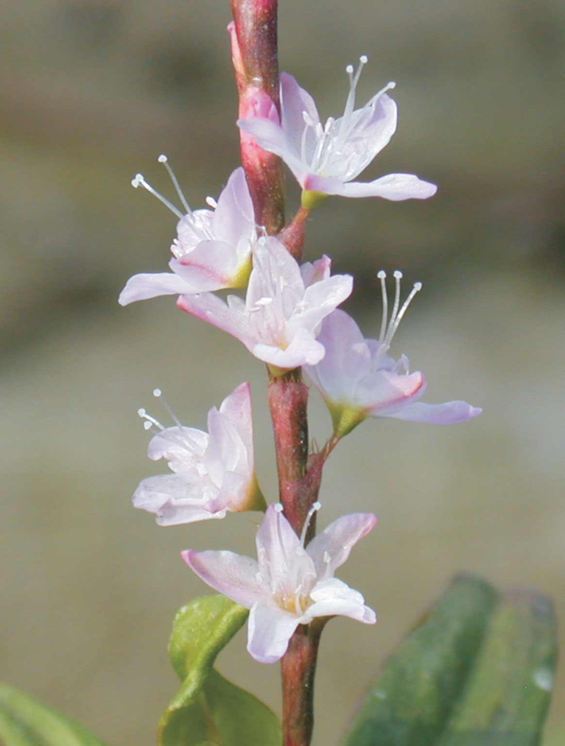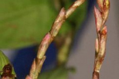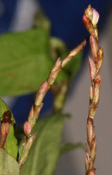 Flowers are arranged in a spike inflorescence which are rarely produced under cultivation and in cold climates. Flowers are produced singly or in pairs or in a small cluster; bracts long and funnel-shaped, with long hairs on margins. Flowers are attractive, hermaphrodite; white to purplish-pink colored (each to 1 ¼ inch long), perianth is pentamerous. It bloom in late summer, but bloom rarely occurs in cool climates. Fertile flowers are followed by triangular shaped fruit, 1.5 mm long, acuminate at both ends, smooth and shiny.