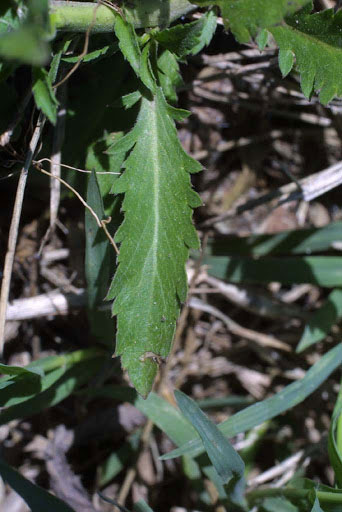 Leaves are in a basal rosette as well as alternate all along the stem. Basal leaves are long stalked, spatula shaped to pinnately lobed and wilt away early. It is about 4-9 cm long and 0.7-1.5 cm across, glabrous, midrib impressed above and prominent beneath, petiole about 0.5-3.5 cm long. Lower stem leaves are irregularly toothed or lobed, 10-50 mm long, up to 3-9 mm across, widest above the middle, tapering to a stalk at the base. Leaves usually become more linear, less toothy, and stalkless as they ascend the stem. Surfaces are minutely hairy. Stem and leaf hairs are cylindric and mostly curved.