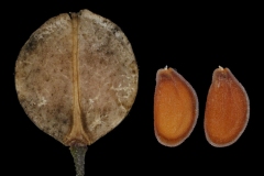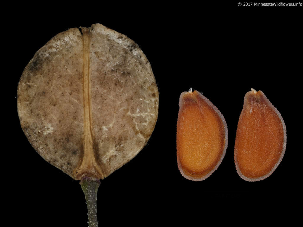 Fertile flowers are followed by a flat pod, round in outline, usually slightly wider than long, widest near the middle, up to about 1/6 inch (4mm) long with a small notch at the tip. It dries to a papery brown shell and splits down the middle when mature.