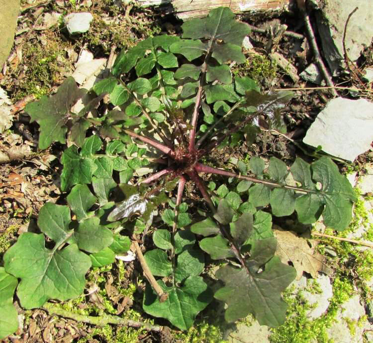 | Leaf | Lower leaves are lyre-shaped, pinnate shaped. The lobes are triangular in shape, the terminal lobe being the largest. The upper leaves are stalkless, smaller, less lobed and they clasp the stems with rounded toothed lobes. All leaves are red-tinged. |