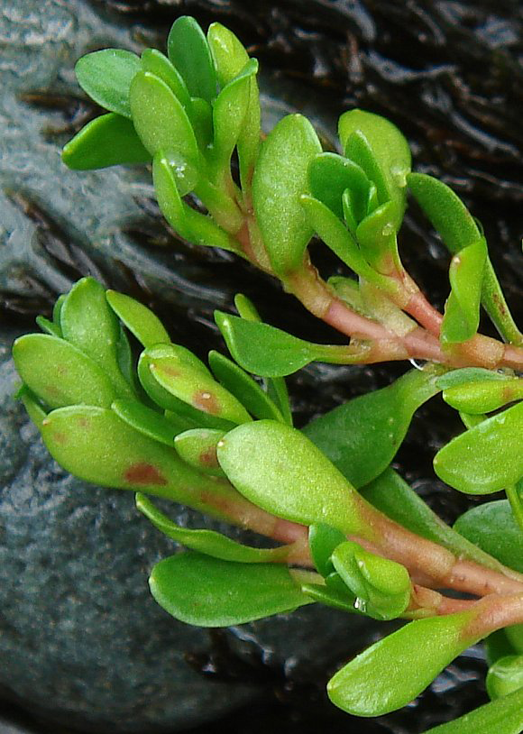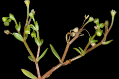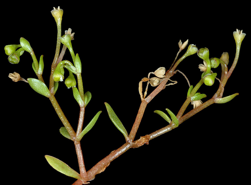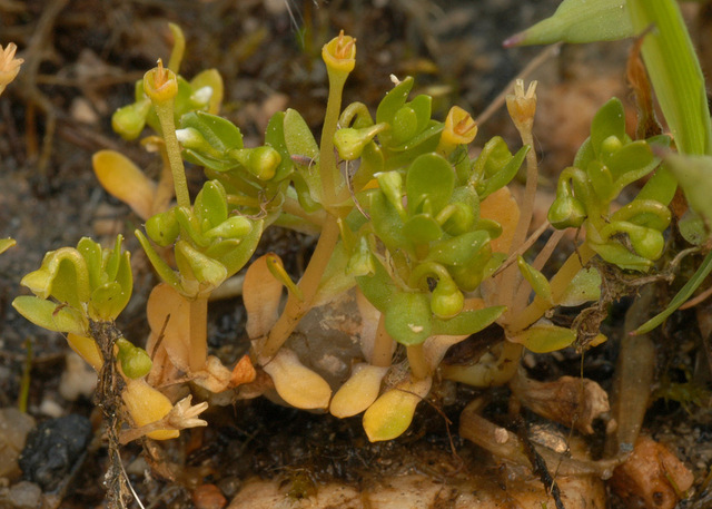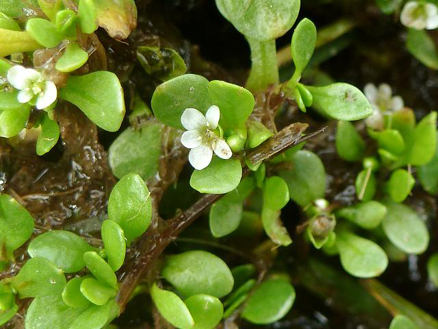 Water blinks is an annual or perennial, glabrous and fleshy herb that may grows about 50 cm or more. The plant is found growing in springs, flushes, lake, river and stream margins, damp tracks, paths and winter-moist sand or gravel, wet meadows, around the margins of ponds, imperfectly drained moist areas, seepage slopes, moss, in wet springy places among mosses, along brooks, or among tall sedges and grasses by the edge of stagnant and muddy pools, less commonly in open places in wet sand or mud when stems become prostrate and somewhat tufted. The plant has taproot with fibrous roots from a lower stem nodes. Stem is thin and branching up to 50 cm or more when it grows in water and shorter when appears in land.