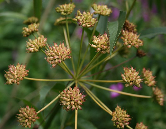 | Flower | Inflorescence arising from the leaf axils or at the tip of the stem. It consists of a compound umbel of 6–16 smaller rounded umbels about 1–2 cm in diameter, each of which has numerous white flowers. There are no bracts on the main umbel and 4–8 small, lanceolate bracteoles at the base of each of the secondary umbels. Plants are monoecious, with bisexual and male flowers in most umbels. |
