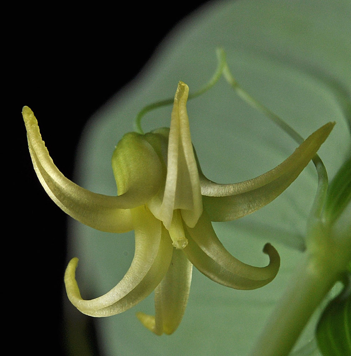 | Flower | Flowers are white and greenish-tinged, bell-shaped (usually single), consisting of six bell-shaped tepals 9-15 mm long. Tepals are oblong-lanceolate, concavely tapering to long, pointed, spreading or bent-back tips. The 6 stamens are of unequal length, the innermost longer than the outer stamens. Each flower has one 3-chambered pistil |
